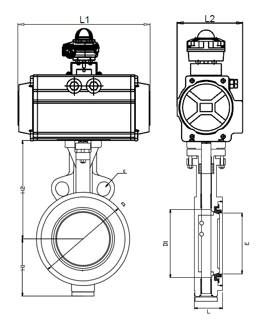 氣動(dòng)高性能對(duì)夾蝶閥外形圖: